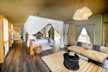 Dans chaque chambre, il y a une terrasse extérieure avec un salon en contrebas qui se transforme en lits, une table avec des chaises, une douche extérieure et une baignoire surplombant la vallée en contrebas.